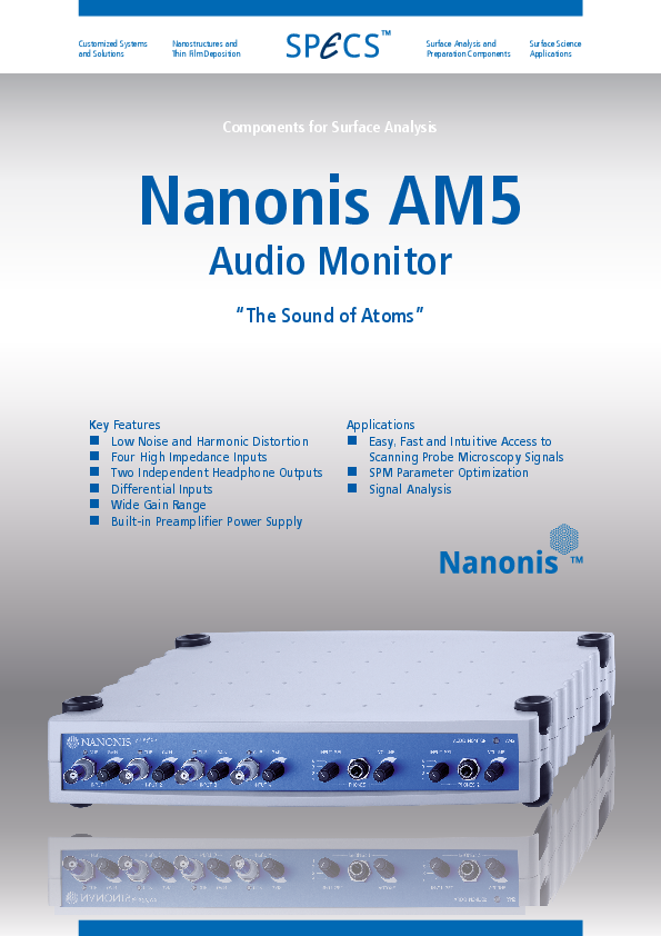 Listen to the sound of atoms. The AM5 is the interface to the most powerful signal analyzer in the world: the human ear. The AM5 is a high performance analog audio interface, designed for extracting even the smallest audible details from a measurement signal. It features 4 high impedance input channels with individual gain control, and two independent headphone output connectors.