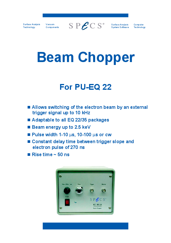 This accessory for the EQ 22/35 scanning electron source uses an external trigger signal to cut off and switch on the electron beam emitted by the electron source. It is compatible with all EQ 22/35 configurations and can be used to integrate the SPECS electron source into custom time-resolved experimental setups. The length of the emission pulse can be selected between 1 and 100 µs. For experiments which require shorter beam pulses, please refer to the Nanosecond pulse unit instead.