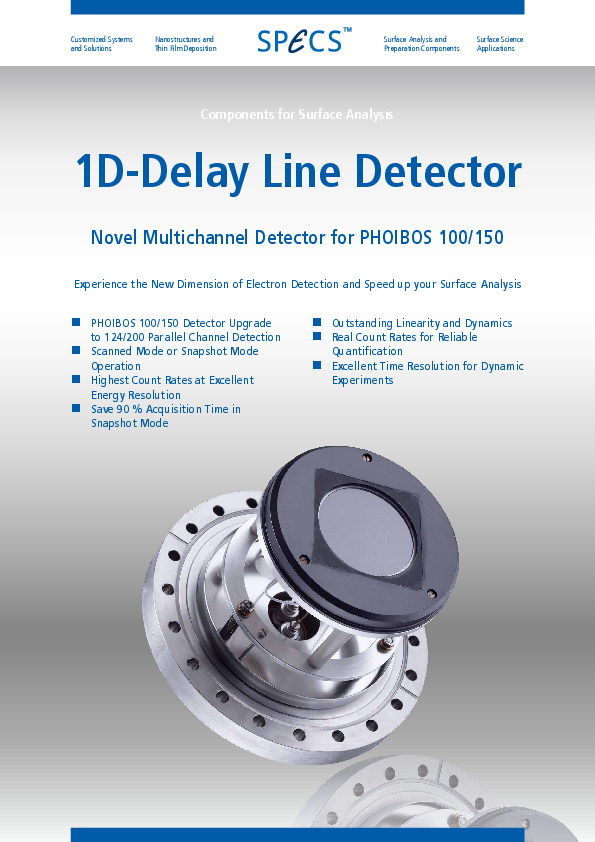 The integrated 1D-DLD detector is the best performing detection system available. The direct detection of electron signals yield quantitative counts per second (cps). The powerful electronics can aquire ultrafast snapshot measurements of the energy spectrum with up to 900 energy channels as well as continous sweeping energy spectra. Its low dark count rate and high linearity make this detector outstanding for XPS analysis.