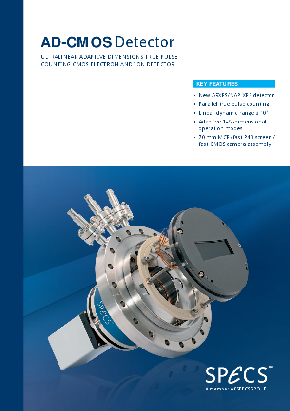 The AD-CMOS detector is a new generation of adaptive detector technology for surface analytics. Using a powerful single event detection mechanism, the AD-CMOS detector is a powerful electron and ion detector with adaptive dimensions, highest linearity and detection efficiency and fast acquisition speed.