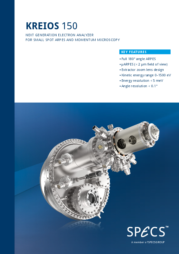The KREIOS 150 MM is a new generation of electron spectrometers for high performance ARPES and PEEM. The unique lens systems combines and immersion lens for PEEM operation with a hemispherical energy analyzer scanning system for unrivaled ARPES measurements. Its lens system aquired the fill half sphere of the electron emission for ultimate angular acceptance of 180°.
