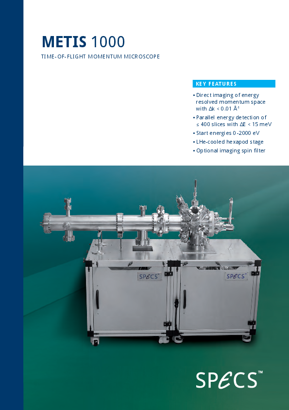 The METIS 1000 is the next generation TOF spectrometer for ARPES and momentum microscopy. If a pulsed light source is available, the METIS 1000 is the intrument of choice. It allows aquisition of two in plane k-vectors against the kinetic electron energy in one shot. The lens system is optimized for high momentum resolution and aquired electrons from the complete half space above the sample, yielding ultimate acceptance angles. The lens design directly shows the k-space on the detector, hence, no conversion from angular space into real space is needed. Integrated deflectors in the microscopy lens allow to move the area of interest without moving the sample and integrated apertures can be used for µ-ARPES or contracst enhancement in PEEM.